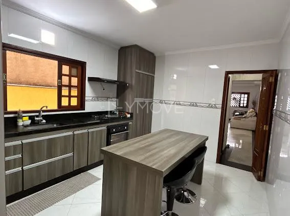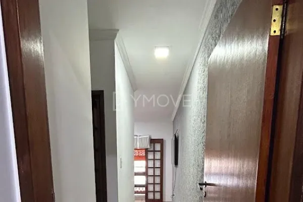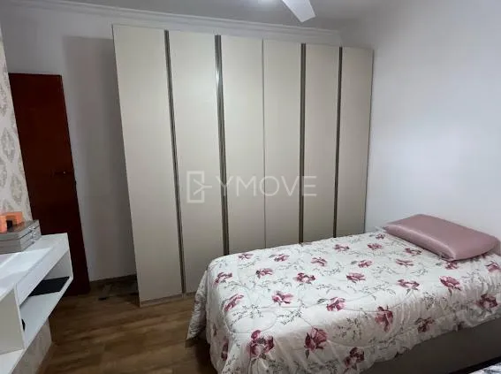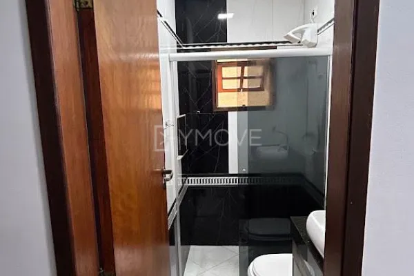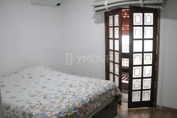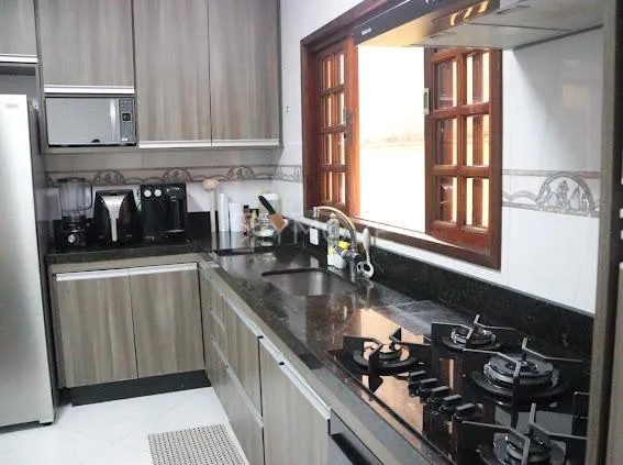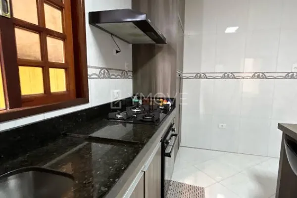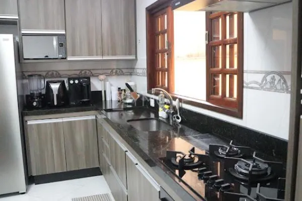 Sobrado 3 Dormitórios (1 Suíte com Ar Condicionado). Acabamento de primeira: quartos em piso laminado, cozinha com porcelanato, armários planejados, cooktop, forno e depurador, e sala em granito. Possui área de lazer com churrasqueira e pia em mármore, lavanderia independente, quintal e garagem coberta para 2 carros.