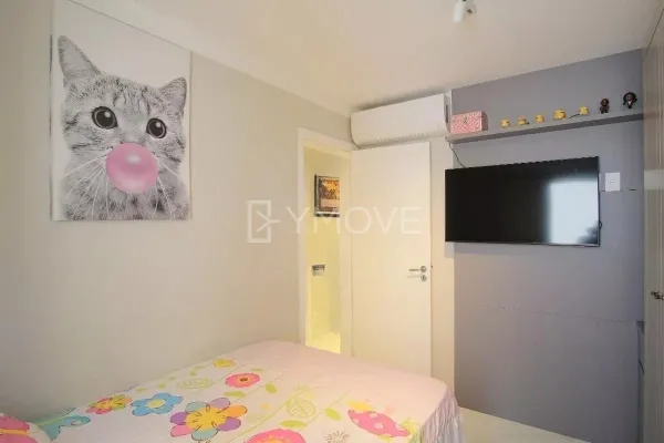 Detalhes: 3 Dormitórios (1 Suíte), sala ampla, banheiro social, cozinha, área de serviço, varanda gourmet e 02 vagas de garagem! Equipado com 03 aparelhos de ar-condicionado, armários planejados na cozinha e nos dormitórios, espelhos e painel de TV na sala.