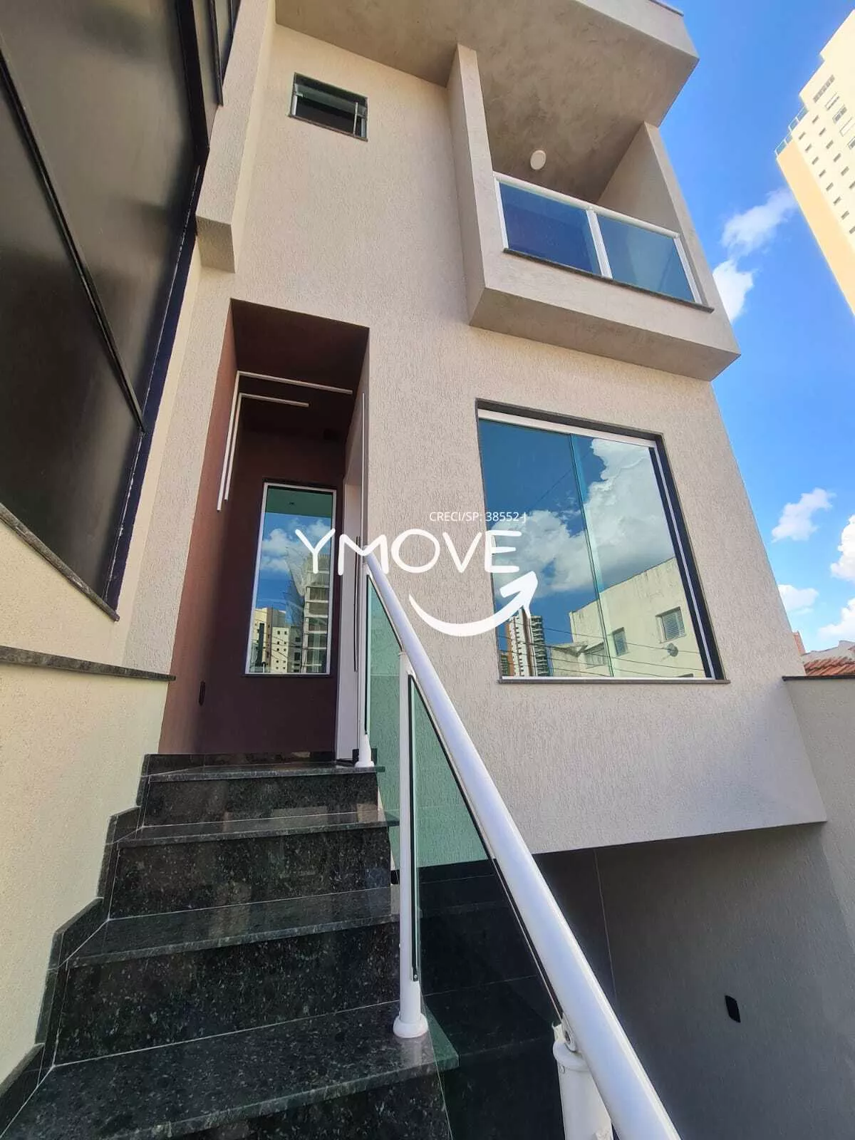 - Escadas com corrimão de vidro e alumínio anodizado, escadas em granito, pias e lavatórios em granito;