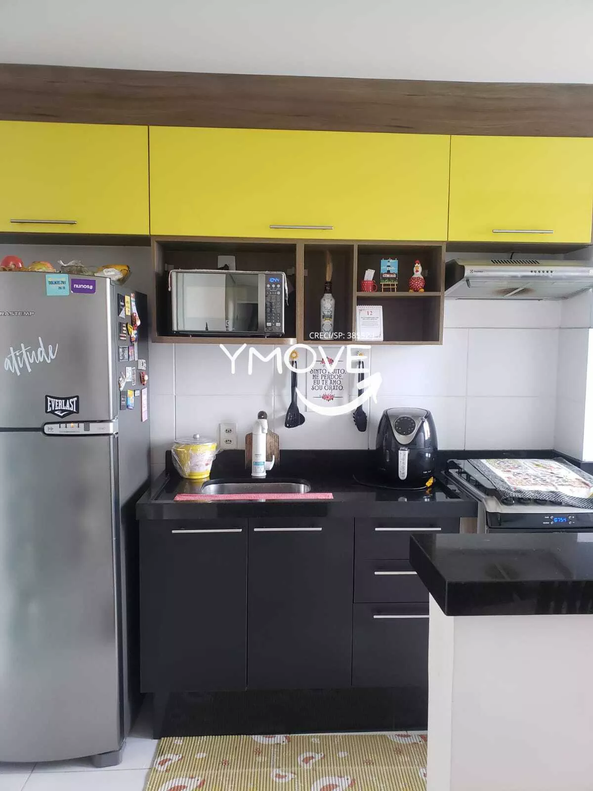 Mesa de vidro com 4 cadeiras, sofá, percianas, painel de TV, fogão, geladeira, microondas, ármarios embutidos na cozinha, mesa de escritório, guarda roupa.
