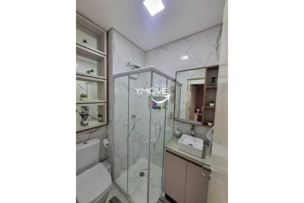 - Banheiro: box de vidro, nichos decorativos, armario suspenso com espelho, pia cuba, e gabinete, tampa e assento sanitário.