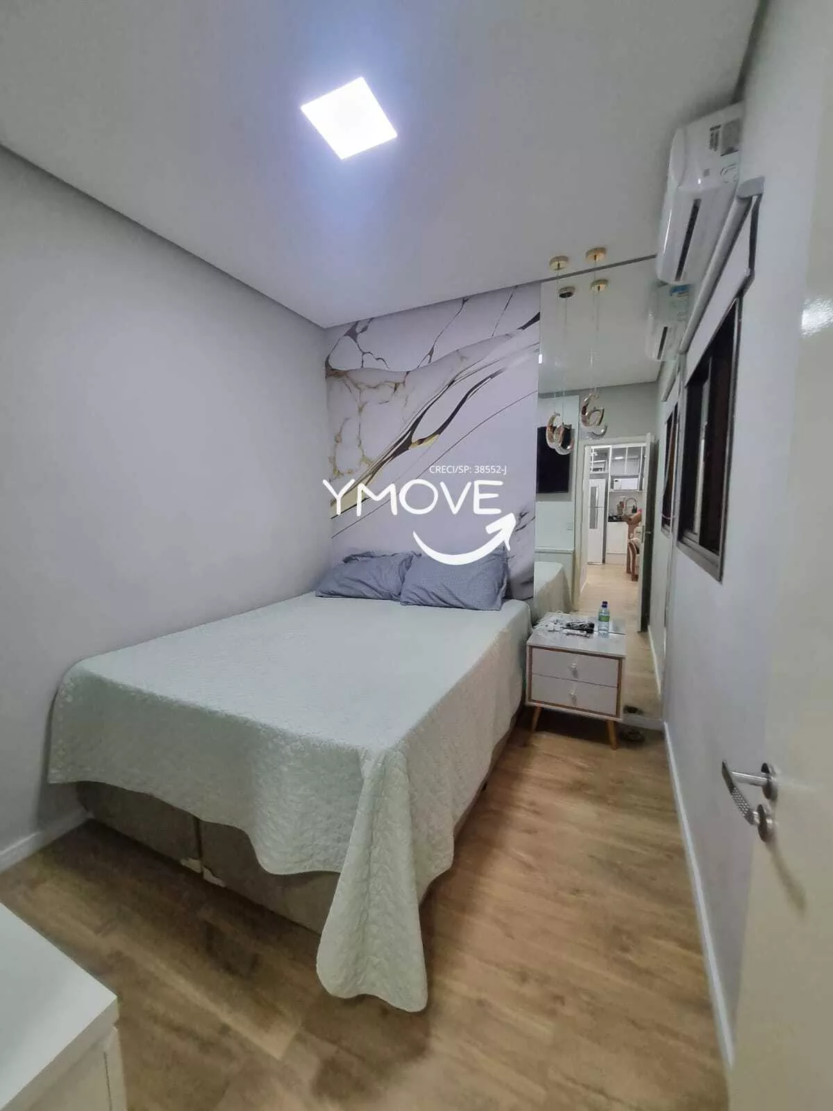 - Quarto 2: Painel de TV + balcão, Ar condicionado, luminárias pendentes; cortina Black-out, espelho.